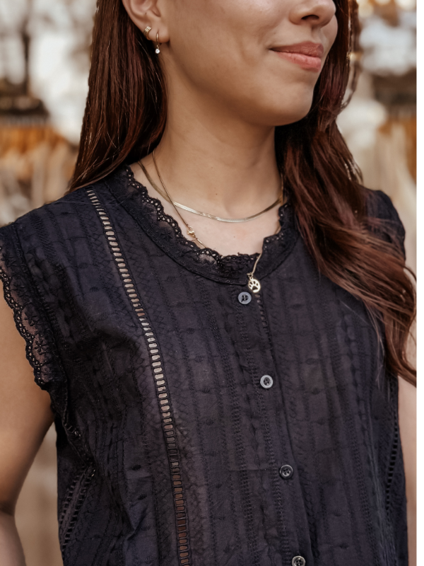 Blusa de encaje bordado con botones frontales y detalles calados que aportan textura y delicadeza.