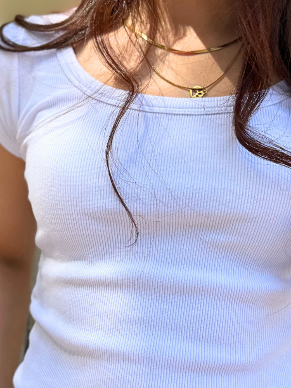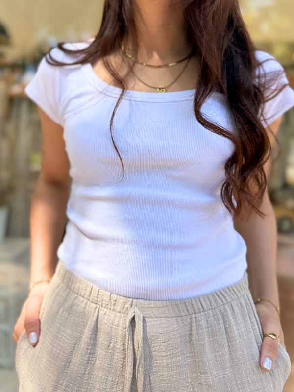 Remera de morley, con escote amplio y calce al cuerpo. Un básico infaltable para combinar con cualquier look de todos los días.