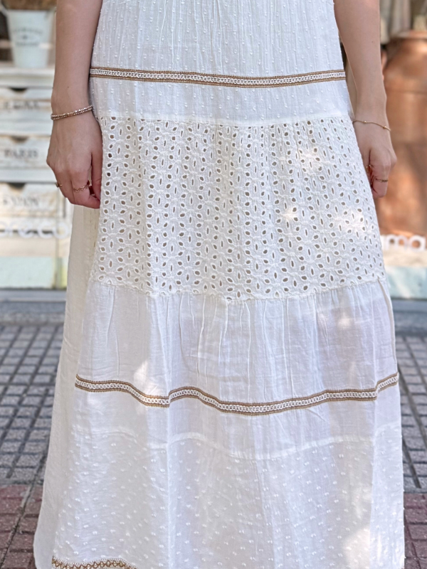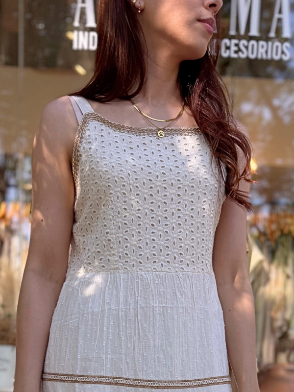 Vestido largo de broderie con breteles finos y detalles en hilos dorados. Tiene una caída suave y femenina, ideal para un look elegante, playero o para usar tanto de día como de noche.
